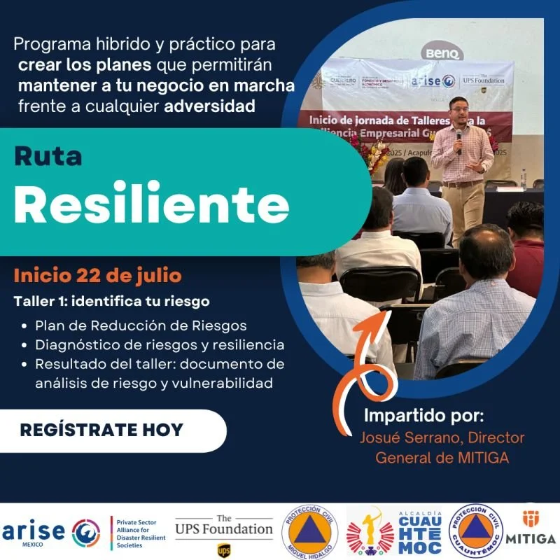 ¿Tu PYME está preparada para enfrentar desastres? La Ruta Resiliente ARISE MX 2025 te brinda un Plan de Reducción de Riesgos y un Diagnóstico de Resiliencia Empresarial para fortalecer tu negocio
